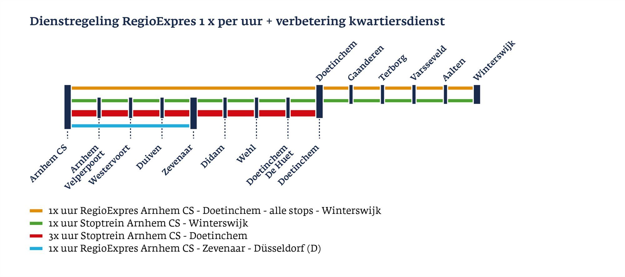 De RegioExpres vergroot de bereikbaarheid voor reizigers van de Achterhoek met een kortere reistijd tot 13 minuten van en naar Arnhem Centraal. Door een betere aansluiting op de intercity’s richting de Randstad en Nijmegen bedraagt de reistijdwinst tot 26 minuten. De kwartierdienst tussen Arnhem en Doetinchem blijft bestaan. Reizigers uit de Liemers profiteren ook van meer zitplaatsen in de stoptreinen, doordat reizigers zich verdelen tussen RegioExpres en stoptreinen. Voor de RegioExpres is spoorverdubbeling nodig tussen Didam en Doetinchem De Huet.